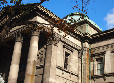 大阪市役所の隣り、大阪市中央公会堂の赤レンガの建物と双璧のレトロな建物が大阪府立中之島図書館です。青銅のドームが特徴です。外観だけでも一見の価値があると思いますが残念な事に今は耐震工事の最中でほとんどの外壁が囲まれてしまっています。