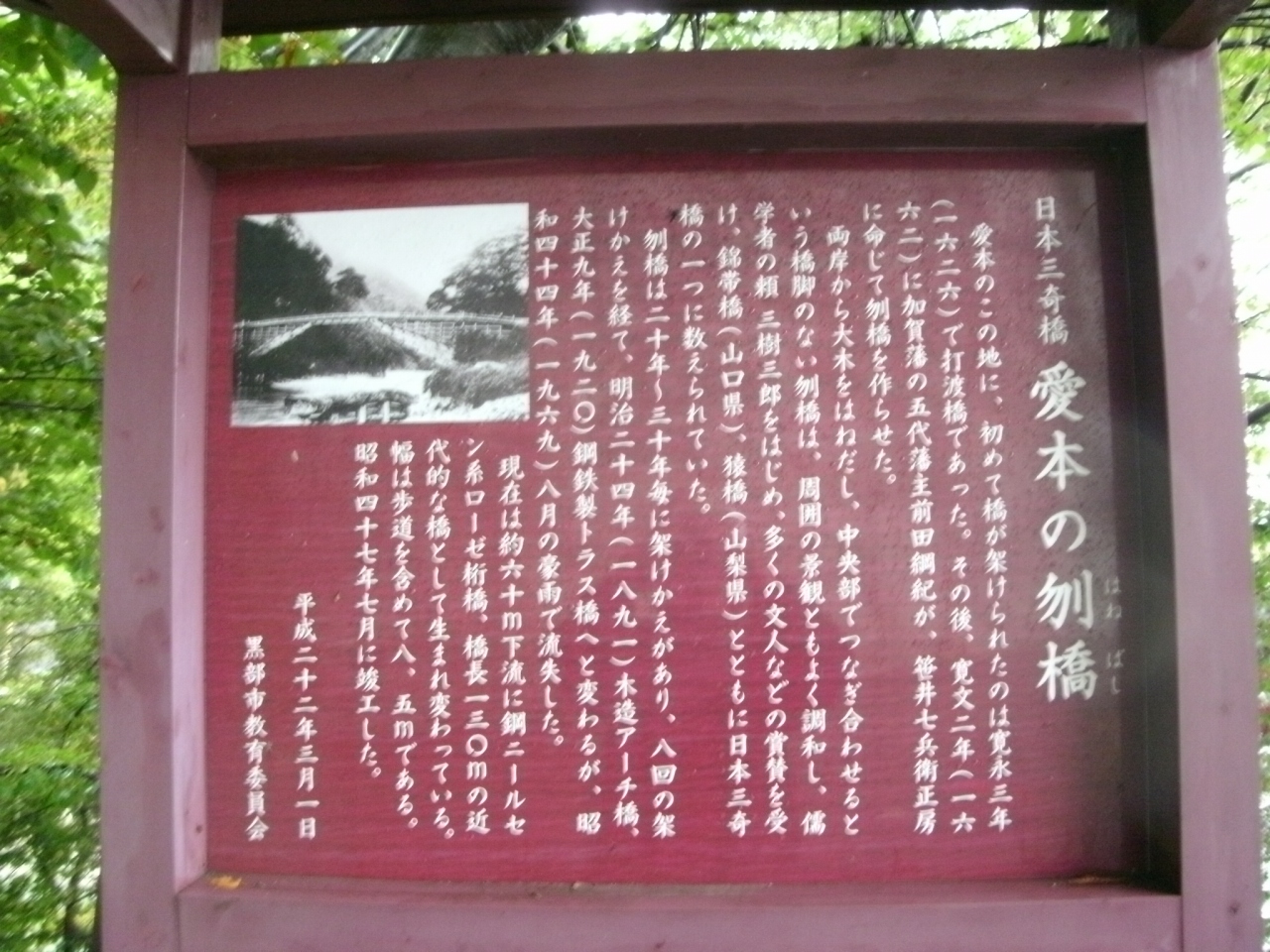 橋の袂には、“日本三奇橋 愛本の刎橋”の説明と写真が示された表示板があります。