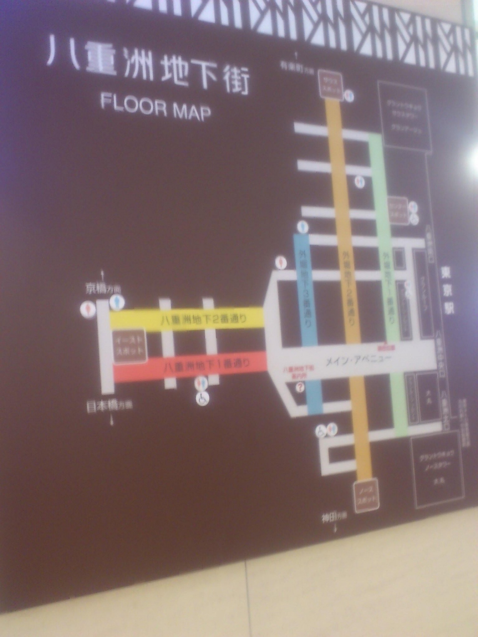 東京駅の八重洲口を出てすぐに地下街へ下る階段があります。中央通りぐらいまで続く長い地下街です。いろいろなビルと直結していますが、逆にぐちゃぐちゃしていて、少しわかりにくいです。雨の日などは、この地下街に入ってしまえば、東京駅までに濡れずに行けるので、便利かもしれません。飲食店が多いですが、一番街よりも庶民的です。