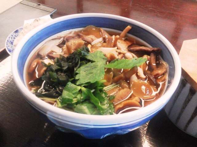 この季節お勧めの温かいキノコそばに「魚沼産コシヒカリ」を追加して頂きました。