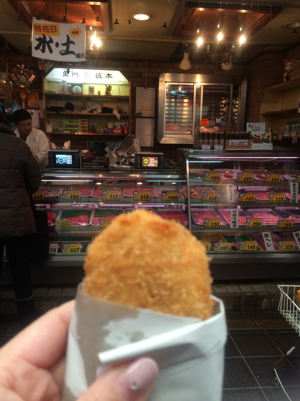 黒門市場内にあるお肉屋さん。店頭でコロッケを揚げてくれます。1個60円です。安いほんでおいしい。あつあつで衣サクサク中もホクホク。揚げたてはやっぱり最強。普段日曜はお休みだけどたまたま開いていたそうでよかったです。