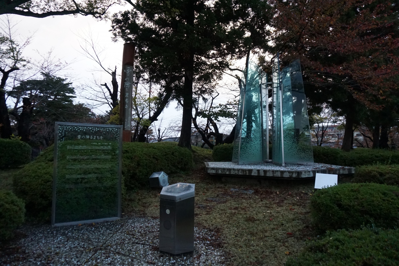 「雪の降るまちを」発想の地 記念モニュメントは、鶴岡公園の疎林広場の端っこ。「雪の降るまちを」は、北国の全般をイメージしていて、どこか特定の場所ではないと思っていたのですが、鶴岡が発想の地なんですね。作曲家、故中田喜直氏が、鶴岡で過ごした雪の一夜が曲想の元なのだそうです。半透明なガラスのモニュメントは、遠くからは目立ちませんが、雰囲気は出ていると思います。