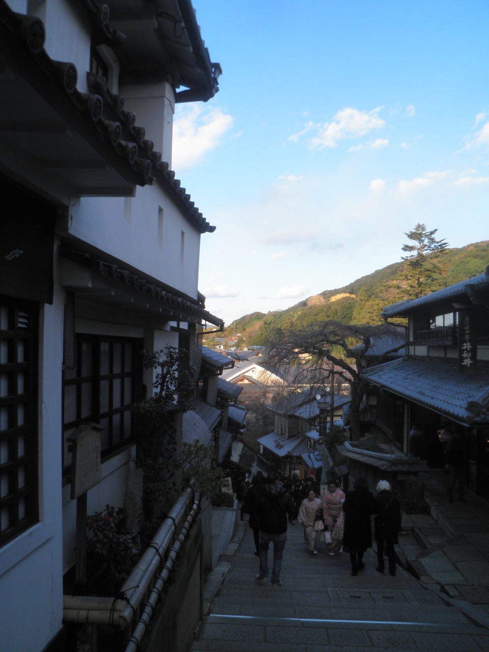 京都の清水寺から八坂神社に向かうとき、三年坂 (産寧坂) を通りました。 周辺は、お土産屋さんや飲食店が立ち並ぶ観光スポットです。 12月上旬に訪れたのですが、紅葉が終わったのに混雑していました。 整備されているけど階段の急な階段があって、人出が多いので時間がかかりました。
