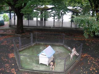 珊瑚寺から坂を上っていくと世界の名犬牧場があり、道の横に並んでいる犬小屋にいる犬が吠えています。大人の入園料が650円ですが、人だけでなく犬も入園料450円がかかるようで、子犬の直売所があり犬好きが訪れるようです。