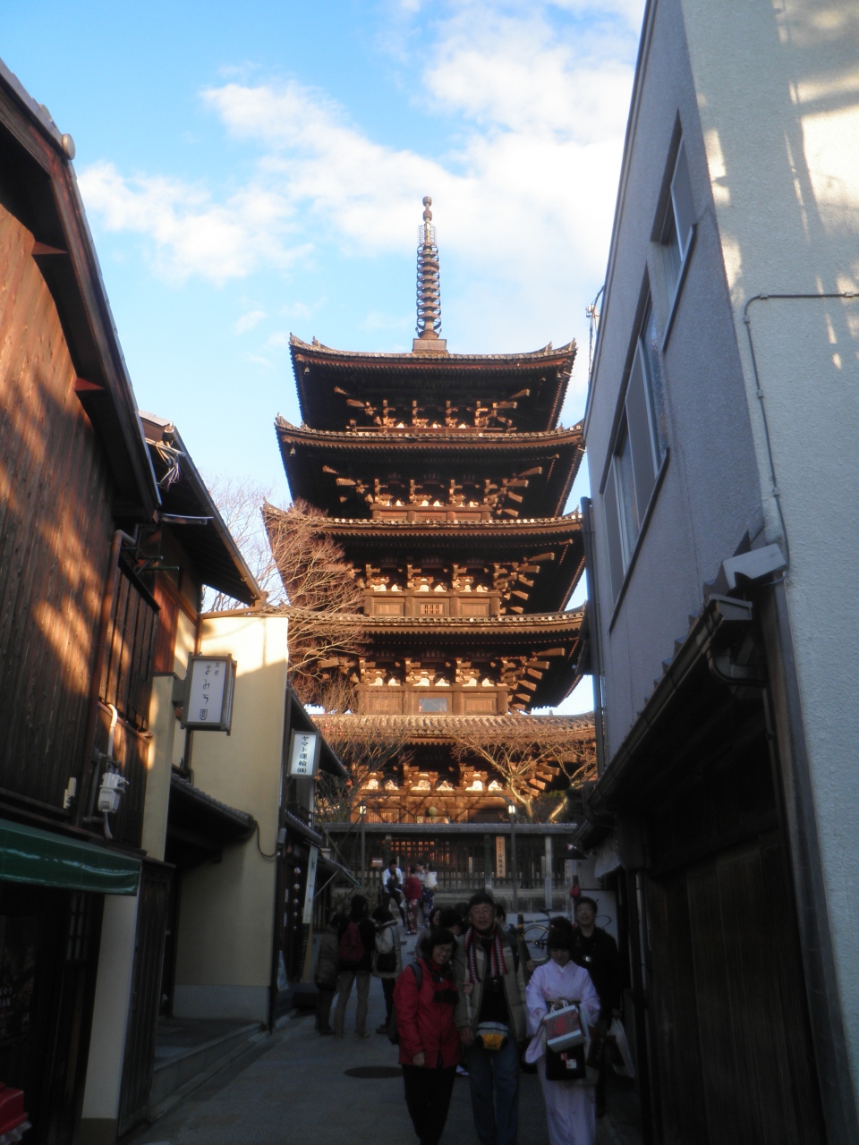 京都の清水寺に参拝したあと、産寧坂と二年坂を下っていきました。 途中で法観寺の五重塔が見えてきました。「八坂の塔」と通称で有名で、坂の下から見上げると、石畳と日本家屋の間からそそりたつ姿が美しいと思います。和服を着た参拝客が多くて絵になりますね。