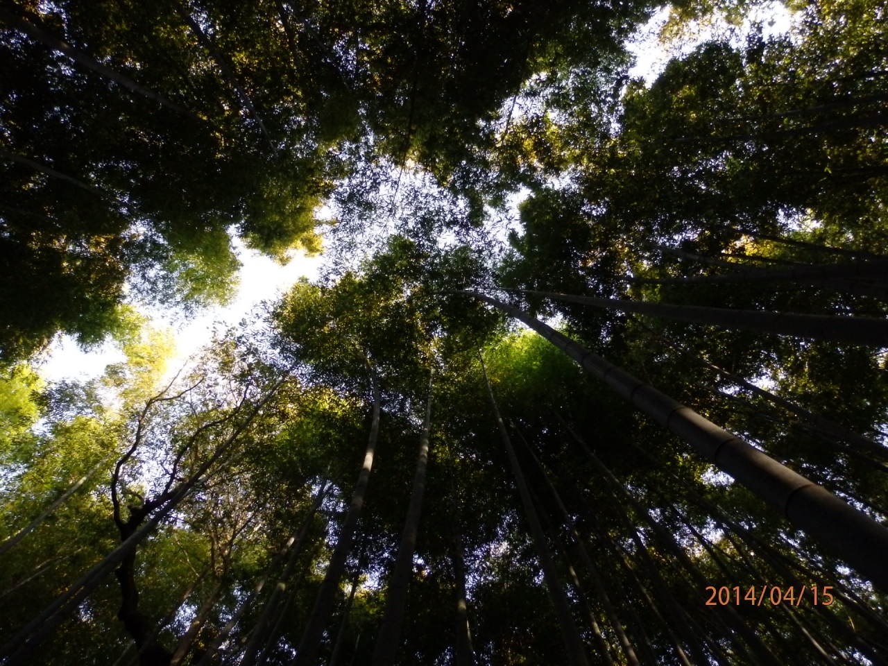やっぱり混んでますね。京都で人気の観光スポットの一つで路の両脇に沢山の竹が並びます。長くそびえたった竹を下から見ると葉っぱの間から見える青空と葉の緑とでなんどもいえず綺麗!下には生えたばかりのたけのこが出でいるのが見れます。