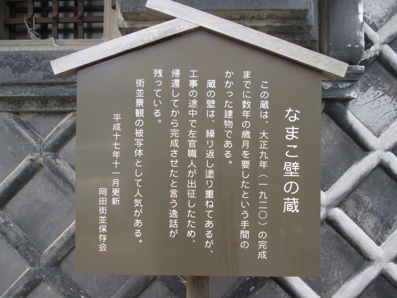 好きです、こういう感じの壁・・・瓦を並べてその継ぎ目に”なまこ状”に白漆喰を何度も塗り重ねてられた”なまこ壁”。大正9年に造られた”なまこ壁の蔵”が今も残っています。いい感じです。昔の町並みが蘇ったような雰囲気を、静かに鑑賞できますよ!!