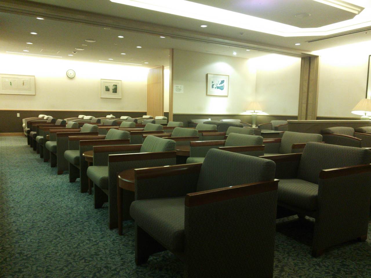 ラウンジ内は、おもったより広々としていて、飲み物や軽食が準備されています。