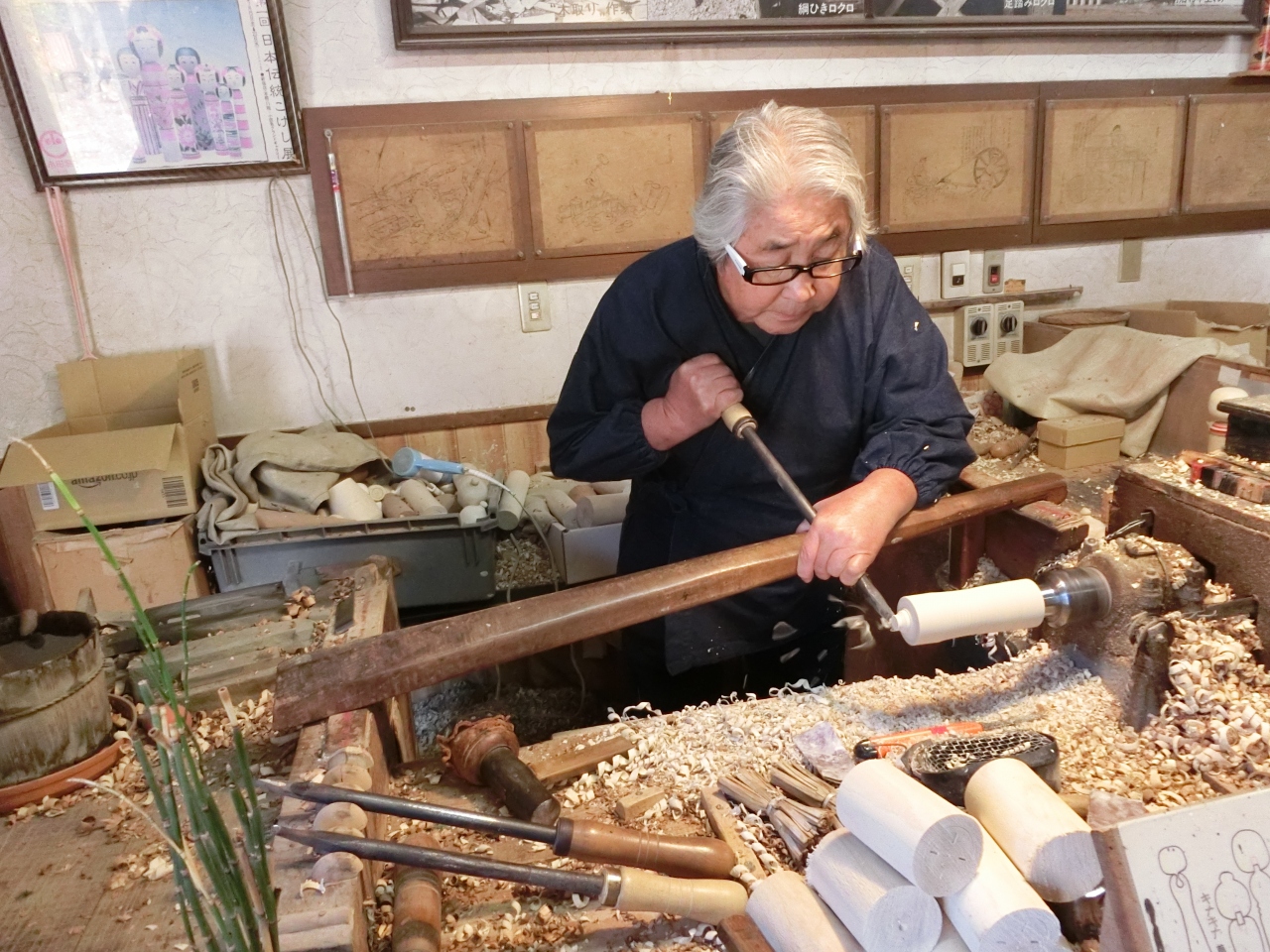 ここの店は、土産物屋と工房があり、実際にこけしを造っているのを見せてくれます。