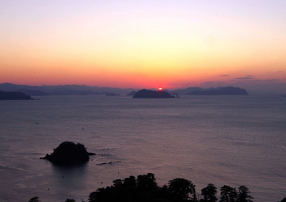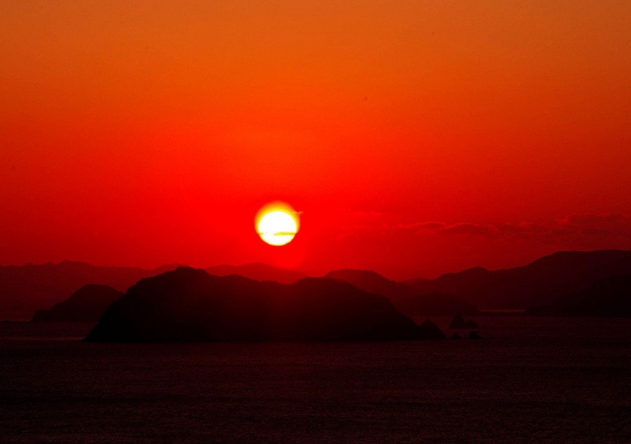 真っ赤な夕日を背中に従えて島影が浮き上がって見えます。