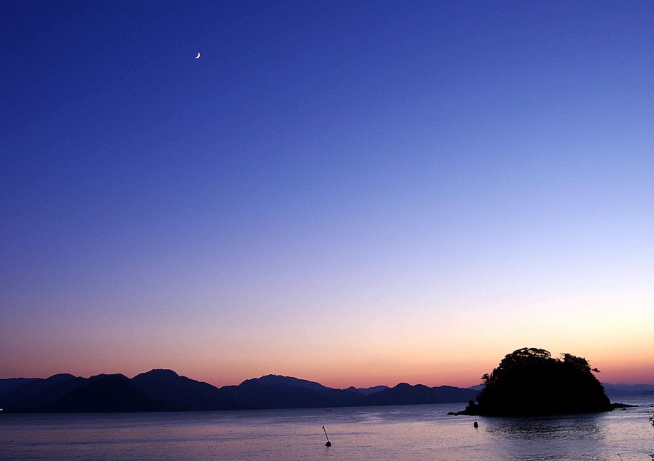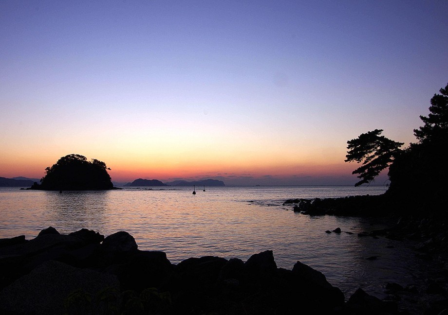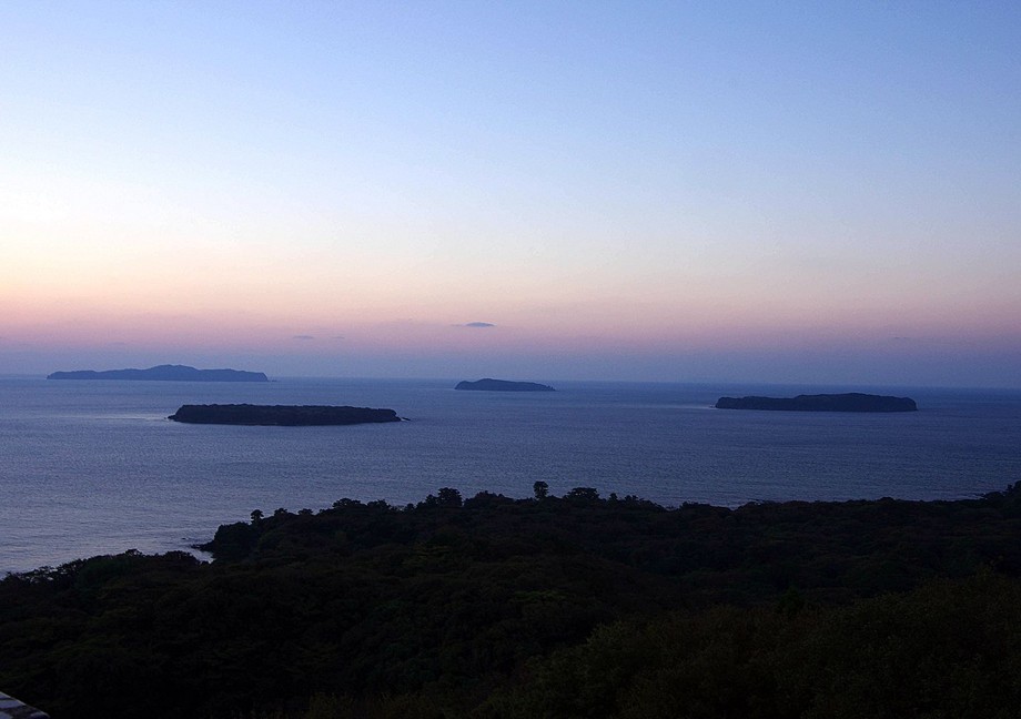 日本海に浮かぶ島々、萩六島の向こうの水平線も紫色を帯びて静寂の中にあります。