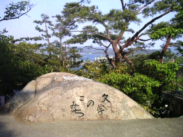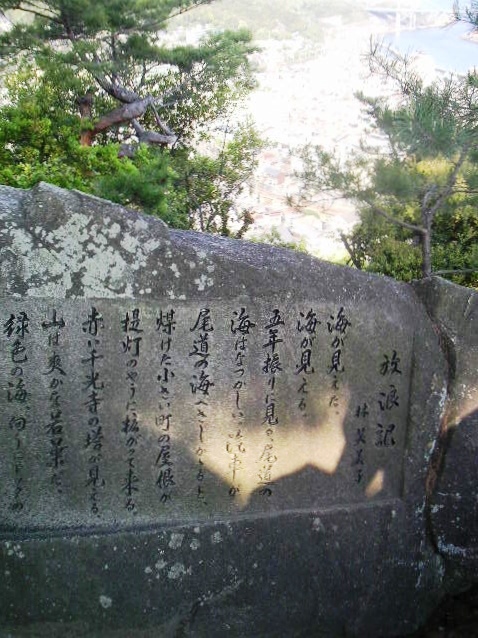 尾道駅から徒歩約20分のところにある文学のこみちは、千光寺公園にある遊歩道です。バス(駅前)や千光寺公園駐車場(有料)もありアクセスは良い方です。ロープウェイの千光寺山頂駅から千光寺敷地内を通り千日稲荷までの約1kmの小道には、林芙美子、正岡子規、緒方洪庵等尾道ゆかりの作家、詩人の作品を刻んだ25基の文学碑(石碑)が点々と続いています。文学のこみちの石碑も入れると26基あります。中でも放浪記碑越しに見えるロープウェイは、ポスター等でも見かける尾道らしい景色です。