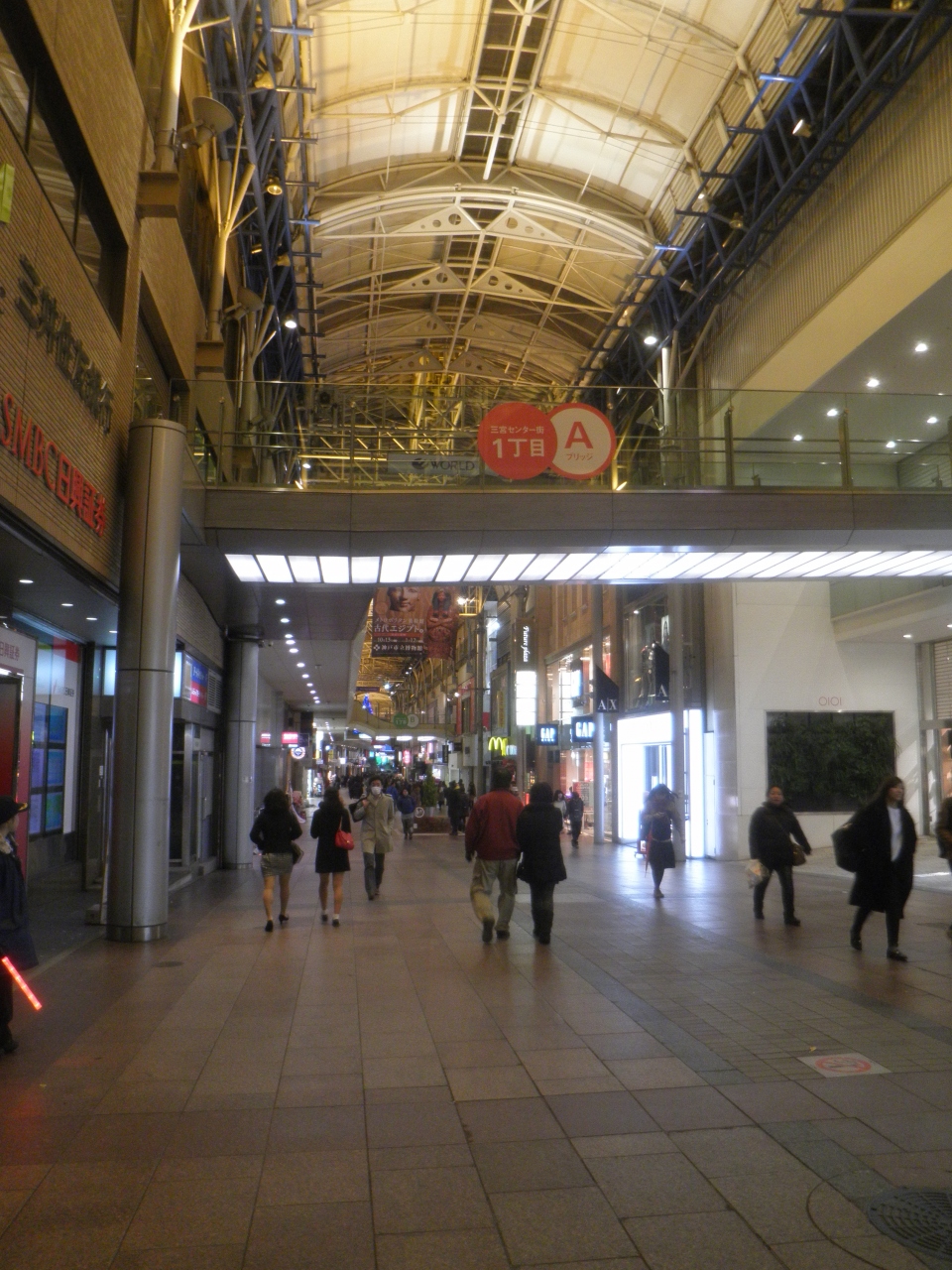 神戸のルミナリエを観に三宮駅でおりると、会場の入り口は元町のほうだと整理員にいわれたので、三宮センター街方向にぶらぶら歩きました。ここはアーケードがあるので、寒い夜でも快適でした。 夜でも人通りがあり、開いている店も多かったです。床はしっかりしていて、道幅も広いです。