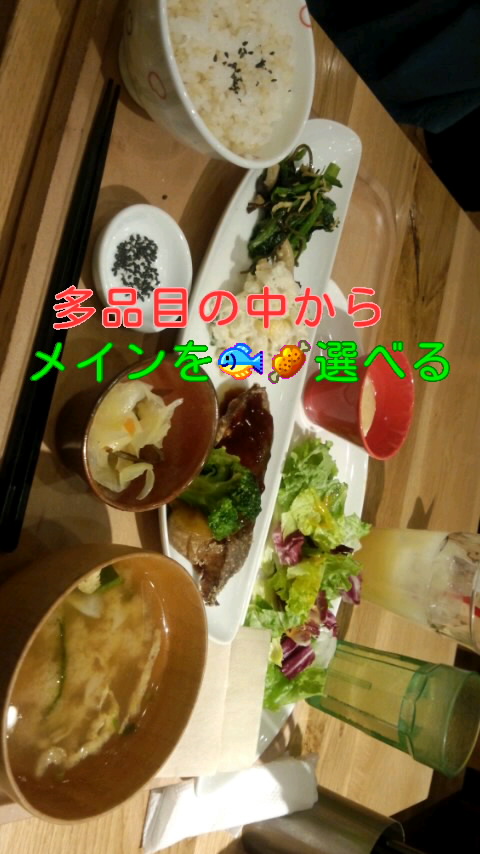 おぼんに、選べるご飯(白、玄米入り、雑穀ひじき)と、みそ汁、惣菜2品、小鉢、豆腐、サラダ、そして、選べるメイン料理と、所狭しと盛り付けられてきます。