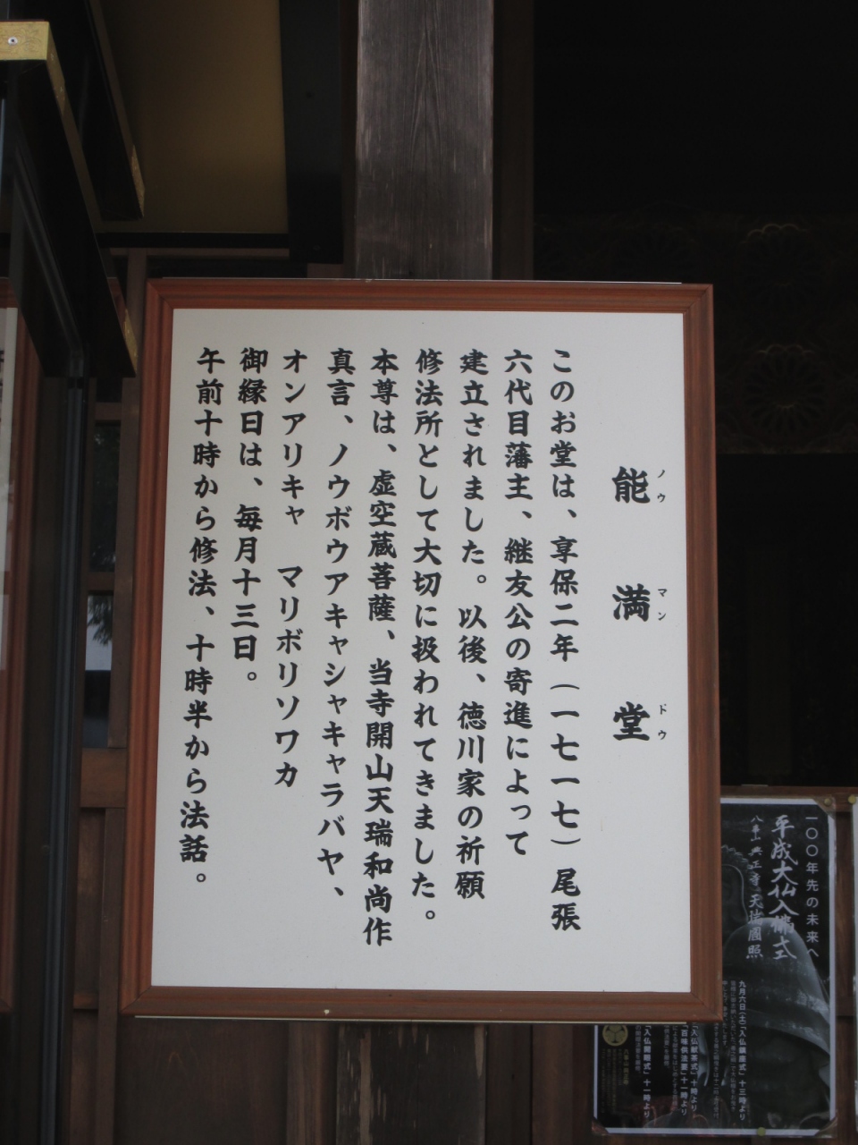 能満堂・・・境内に歴史ありそうな建物がありました。1717年尾張徳川家六代藩主によって建立され、以後、徳川家の祈願修法所として大切に守られてきたとか。小高い丘の上に鎮座していて、威風堂々の趣を出していました。説明看板には、「ノウボウアキャシャカラバヤ、オンアリキャ、マリボリソワカ」という呪文(?)のような文言が書いてあり、神秘的な雰囲気を感じました。
