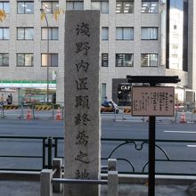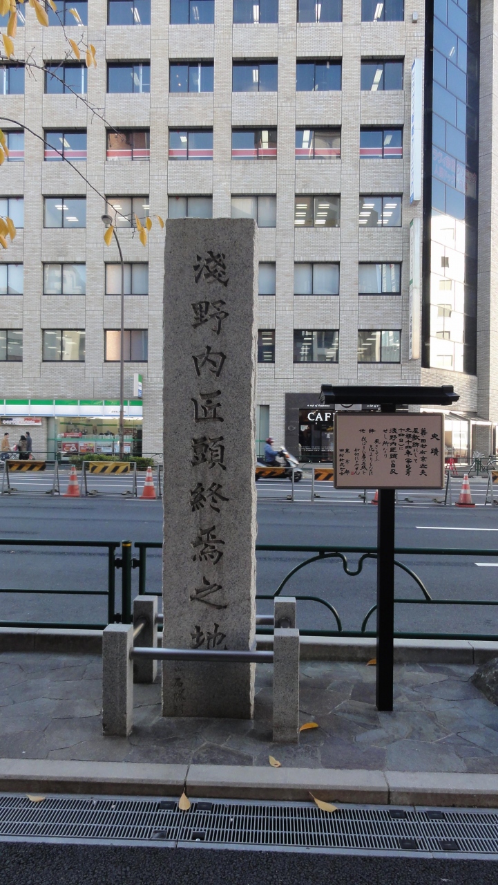 殿中で刀を抜き、吉良上野介に切りつけた赤穂藩第3代藩主、浅野内匠頭が切腹した田村家上屋敷のあったところです。昭和15(1940)年、紀元2600年を記念して設置されました。「「風誘う花よりのなお…店」の有名な辞世の句も掲示されています。