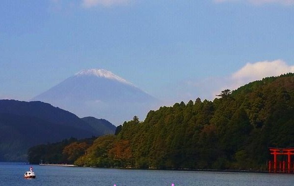 背後に富士山、右横に箱根神社の赤い鳥居が良いアクセントのように映ります。
