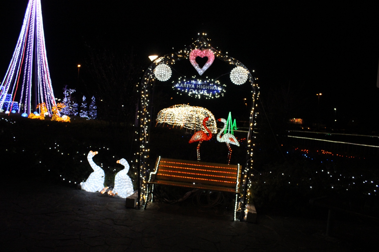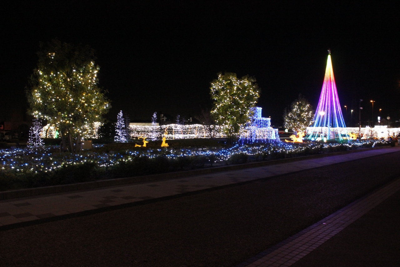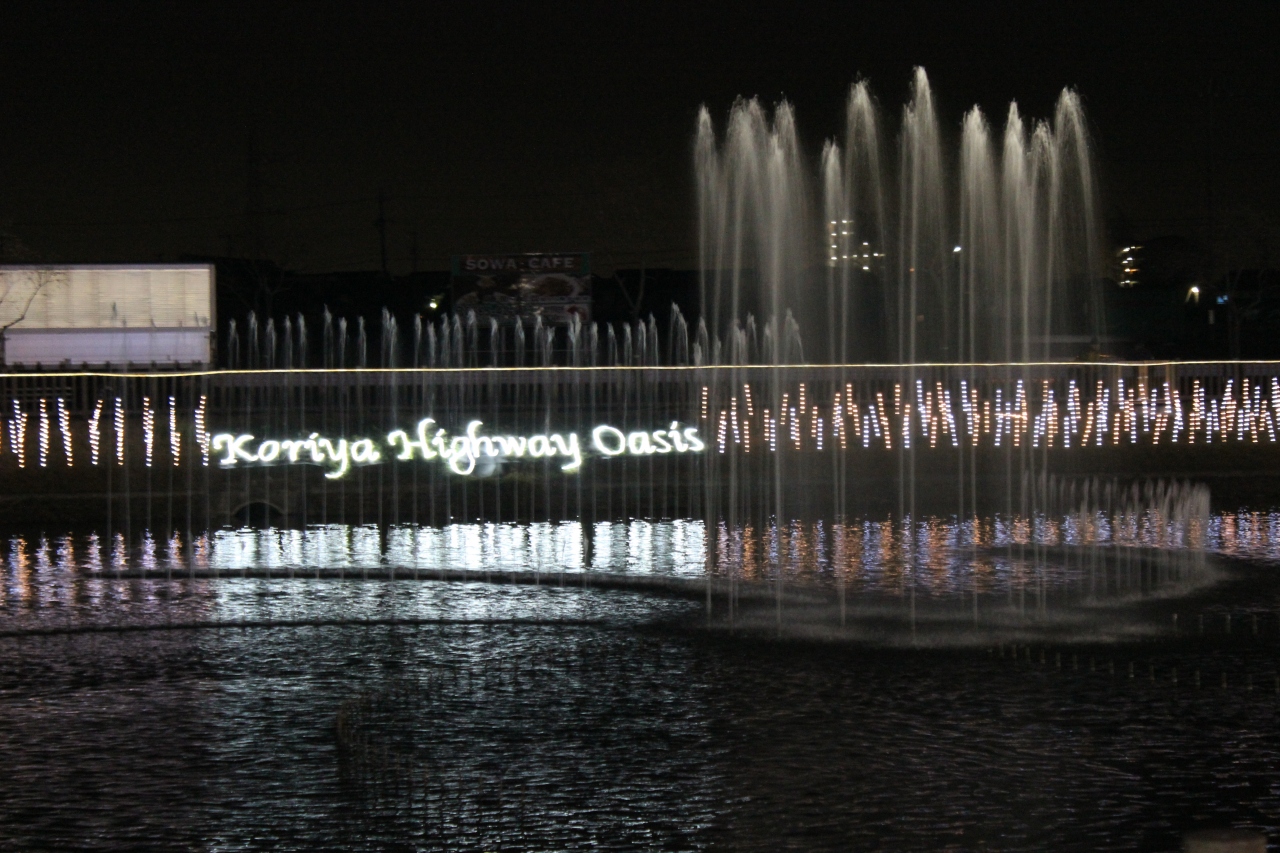 湾岸自動車道の高速サービスエリアの駐車場の休憩施設兼売店の西側の一段下がった処に、広場と池が有りますが、其処を利用してイルミネーションが点灯されています。