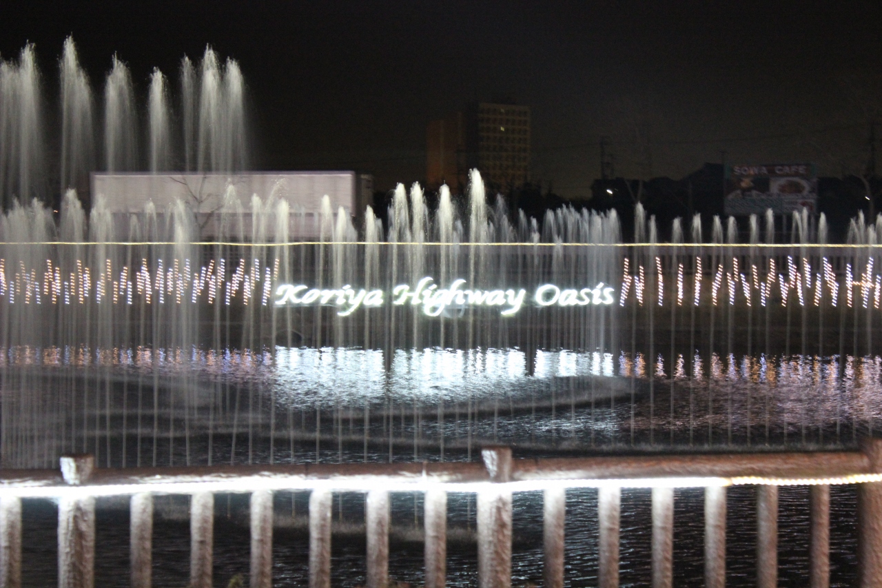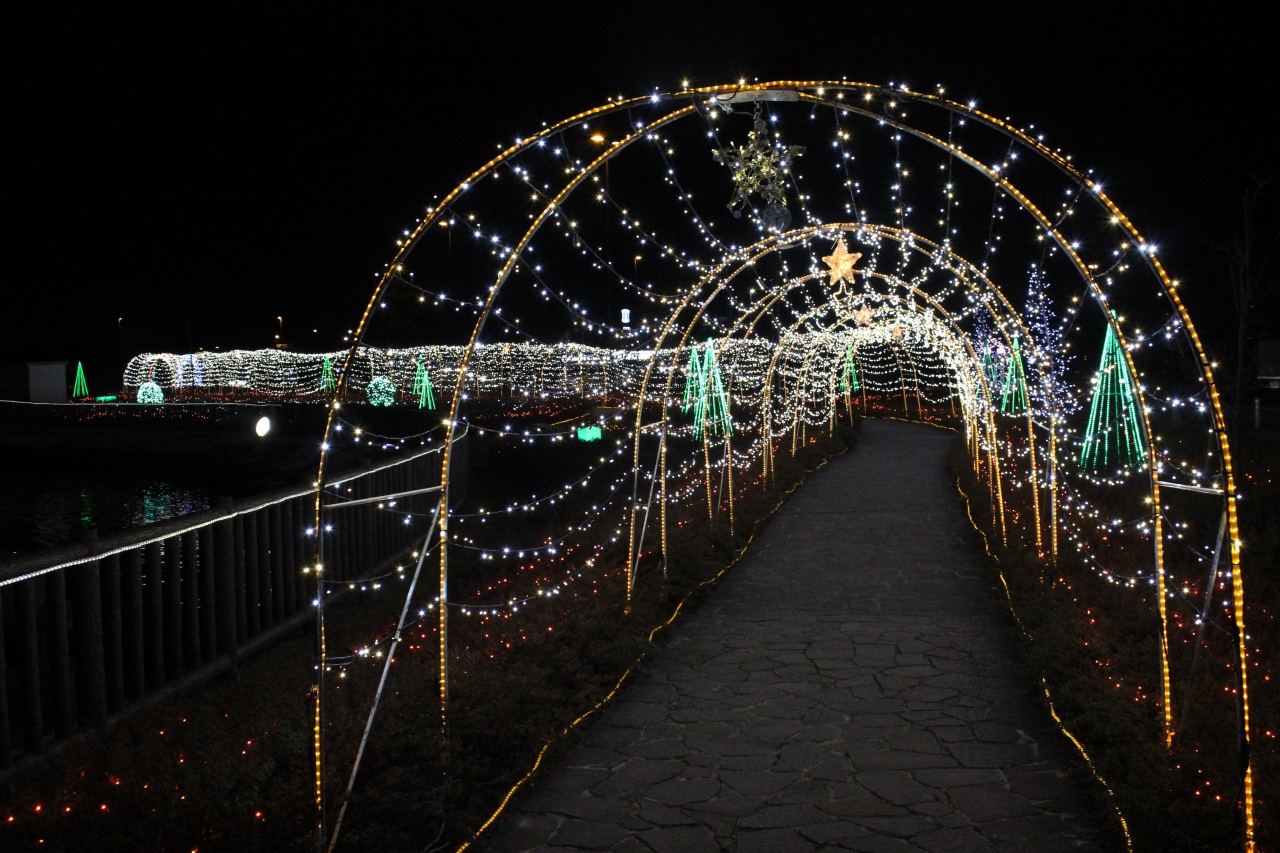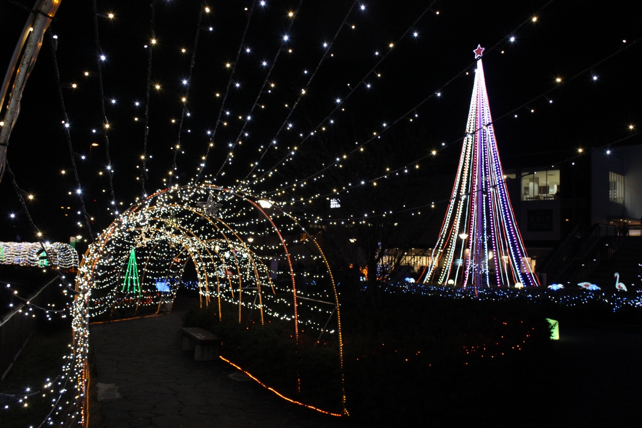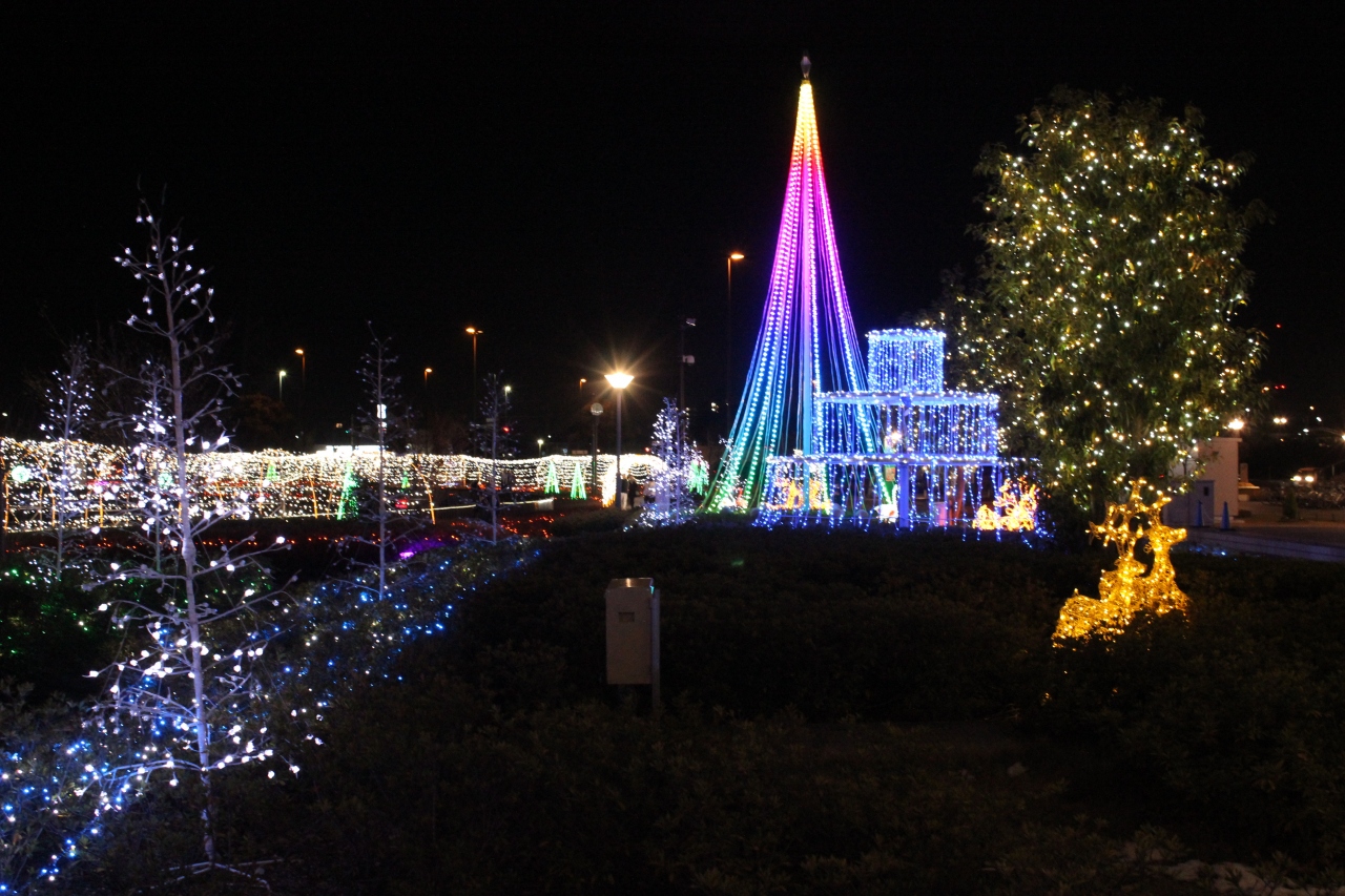 湾岸自動車道の高速サービスエリアの駐車場の休憩施設兼売店の西側の一段下がった処に、広場と池が有りますが、其処を利用してイルミネーションが点灯されています。