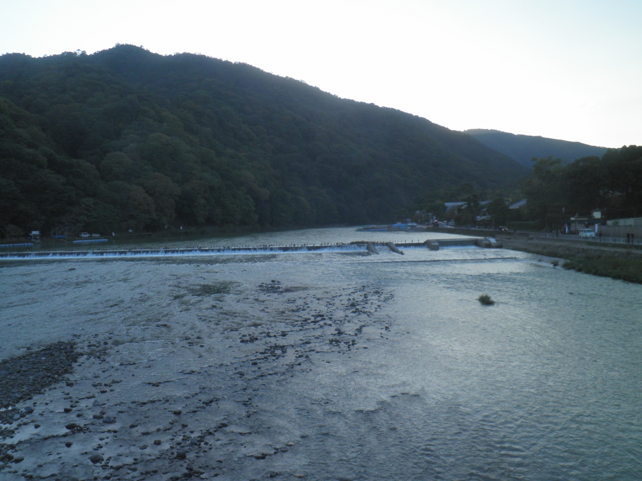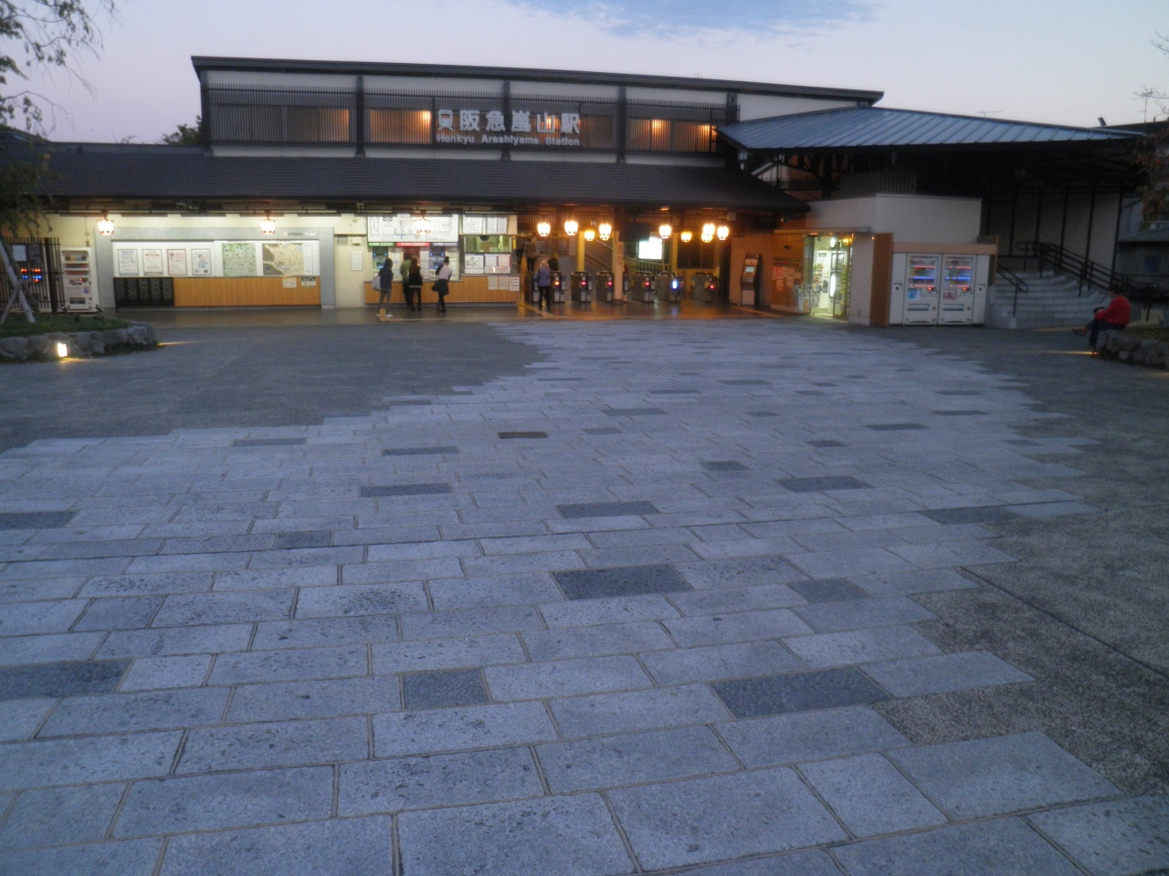 京都の嵐山の渡月橋からの景色を見に、嵐電の嵐山駅から、渡月橋を渡って阪急嵐山線の嵐山駅まで徒歩で歩きました。 もう日暮れが近いせいか、あまり人は多くありませんでした。 何度見ても形式が風情があって、なかなかいいです。 日が暮れたあと、阪急の嵐山駅のあたりの風情もいいです。