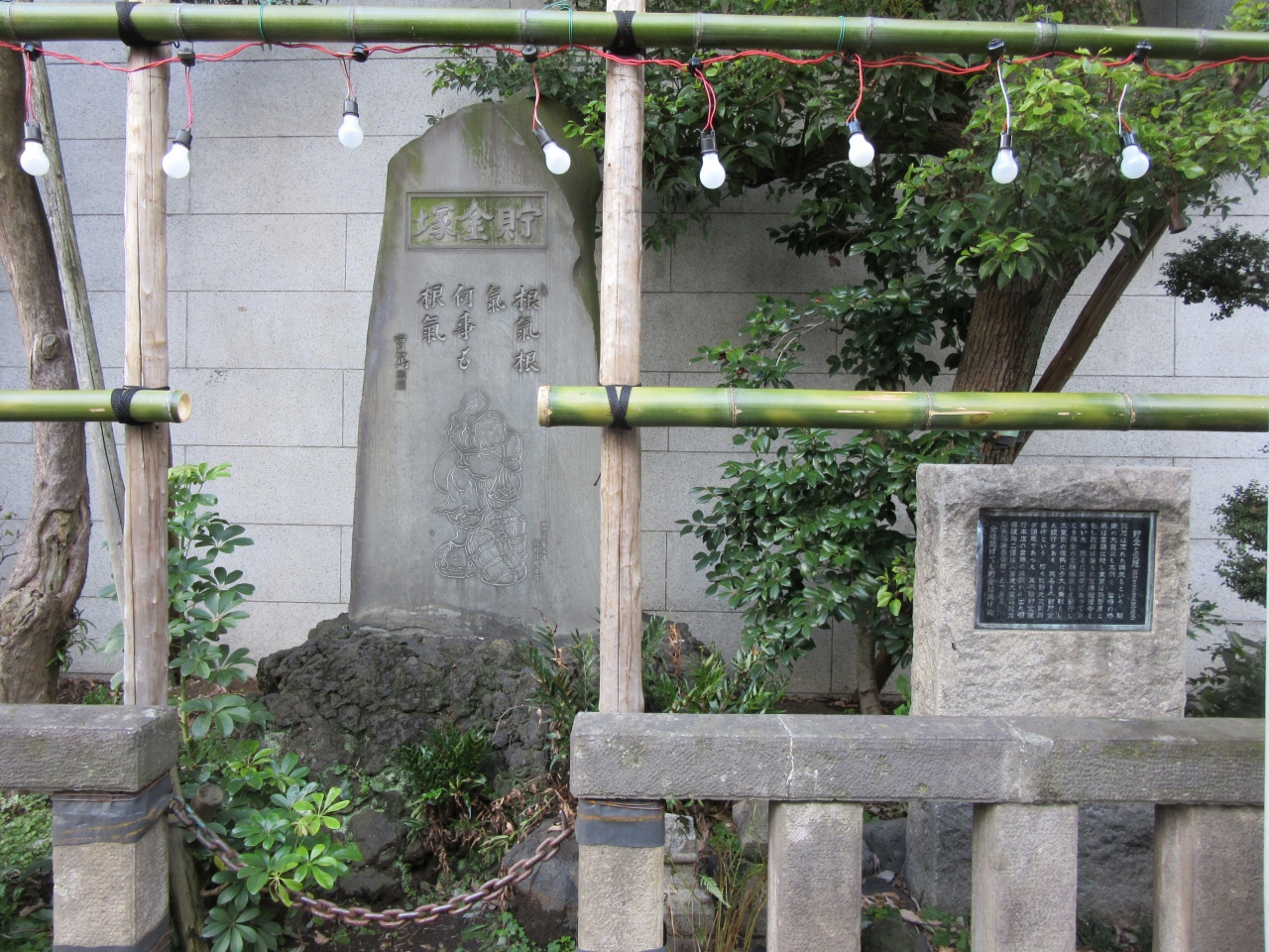 石段下両脇に塚碑がふたつ。向かって左が生姜塚、右が貯金塚。ここの歴史を伝えています。