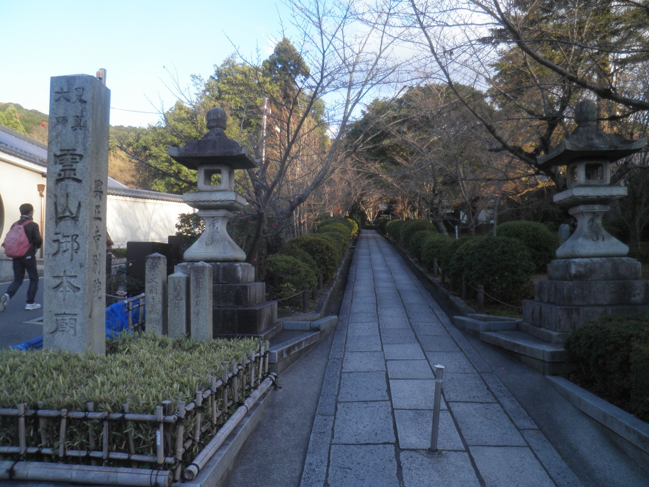 京都の清水寺にのぼったあと、産寧坂と二年坂を下って八坂の塔に行きました。 途中で、興正寺霊山本廟とかかれた看板があって、その近くに両側に灯篭のある石畳の参道を歩いていきました。 産寧坂や二年坂のあたりは参拝客が多くてにぎやかでしたが、ここは静かな感じでした。