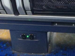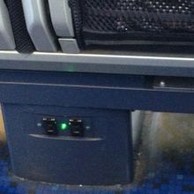 各座席の下に電源がついていて便利です。パソコンやスマホ(ケイタイ)用に使えます。乗車時間が40分程度なのでフル充電するには時間が足りないかもしれません。