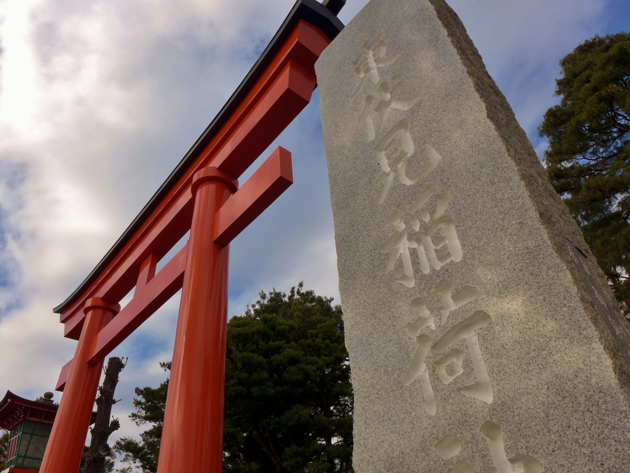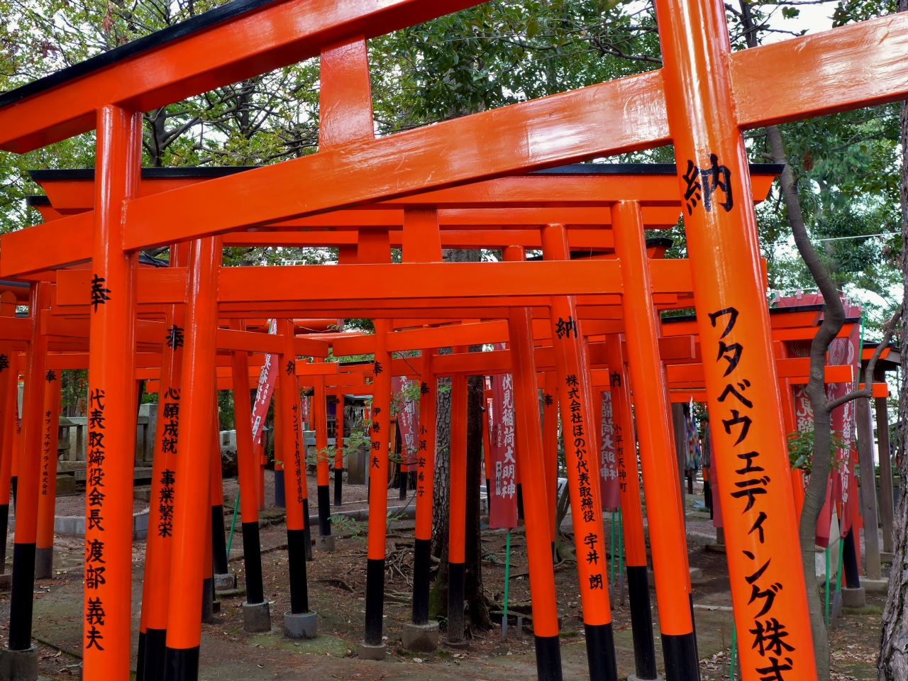 朱塗りの大きな鳥居を潜って石段を上がると立派な社殿が、また社殿の裏手には小さな沢山の鳥居と狐を祀った「お塚」がありました。