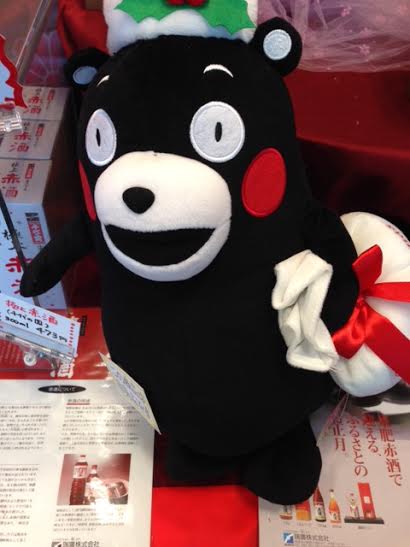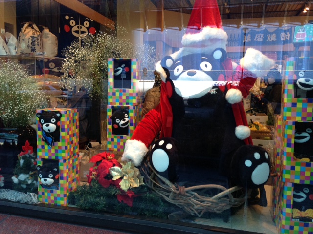 銀座にある熊本県のアンテナショップにはあらゆるところに「くまモン」がいます。時期的にサンタクロース姿に扮していて(無理やりっぽいが)可愛いらしいです。店内は焼酎、調味料、etc、久しぶりに辛子レンコンも見ました。お客さんもたくさんいました。