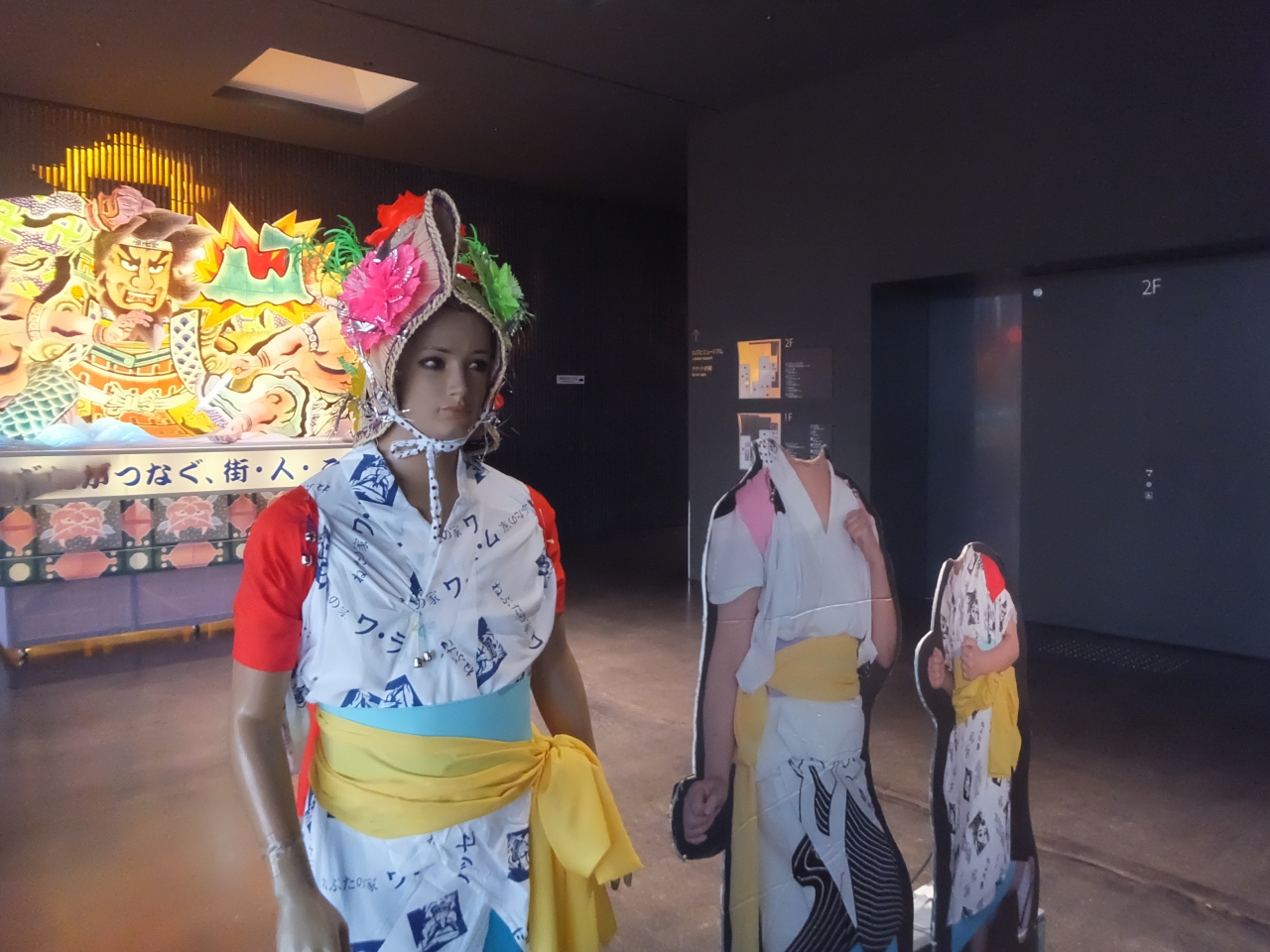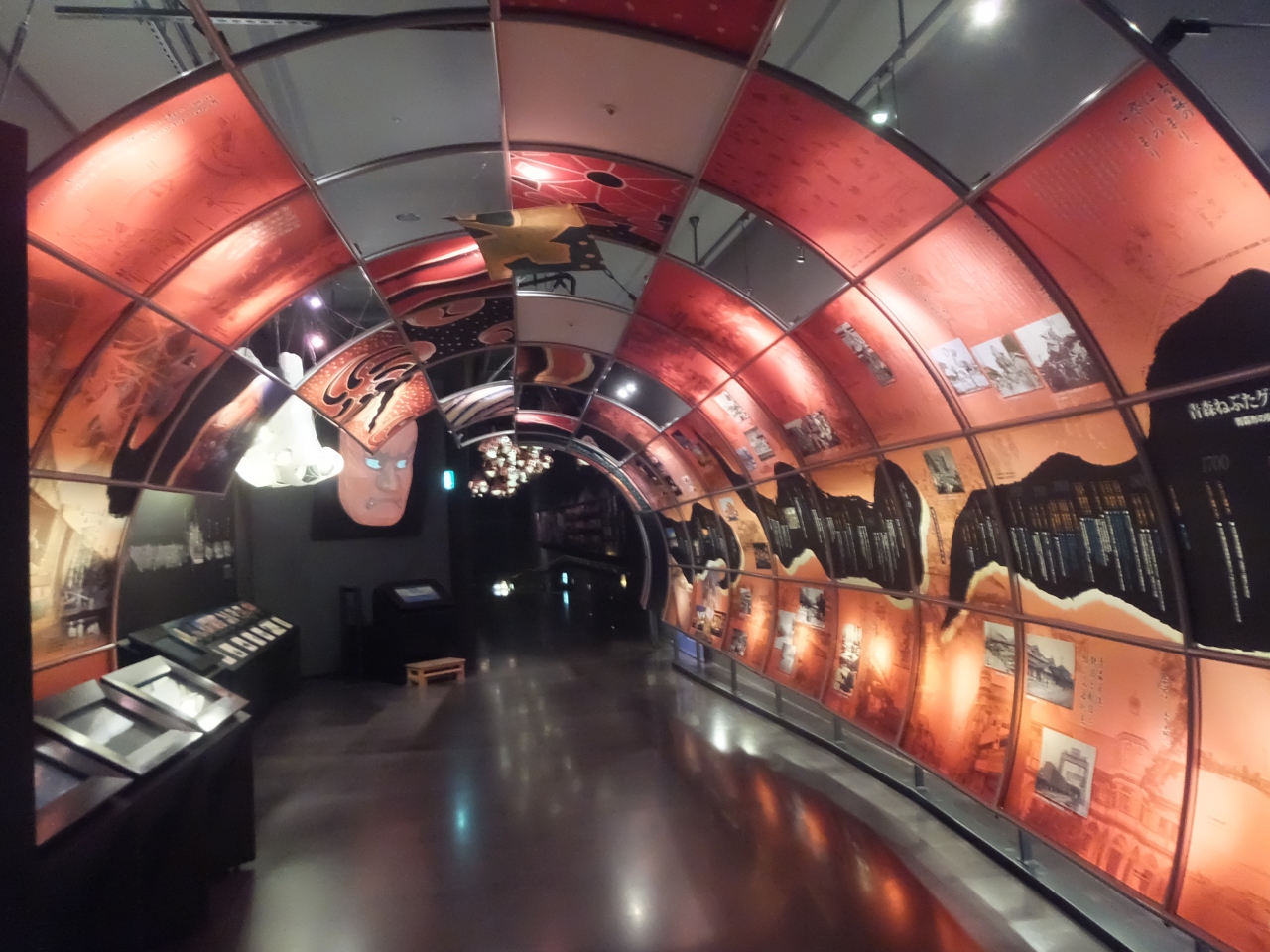 展示スペースに至る通路沿いには、ねぶたの歴史や制作過程などを解説する資料が並びます。祭りのねぶたを既に見た人も、まだの人も、祭りの賑やかさには欠けますが、祭りの時には鑑賞しきれない細部をゆっくり落ちついて味わうことのできる施設です。なお、イベントホールも兼ね備えていて、訪れた時には青森県民謡グランプリの予選会が開かれていました。無料で鑑賞できたので、運よくイベントの時に訪れた時は併せて鑑賞していくとよいです。