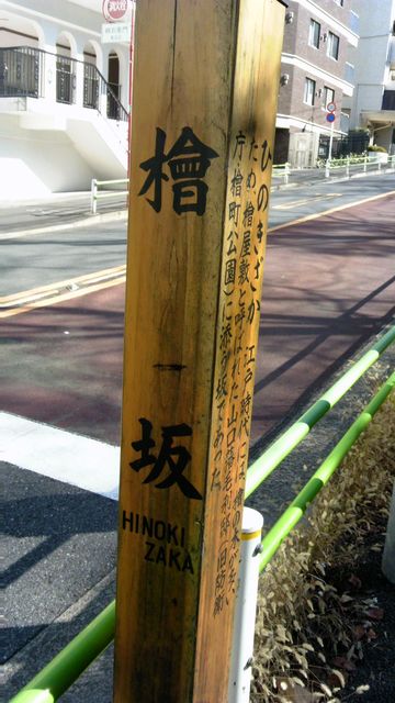 六本木駅で降りてミッドタウン・イーストの建物の横の道路を進み、公園の向こうの道を左折するとあるのがこの檜坂です。坂名の標識の横に『檜の木が多いため「檜屋敷」と呼ばれた山口藩毛利邸の屋敷があった』と由来が書かれてました。