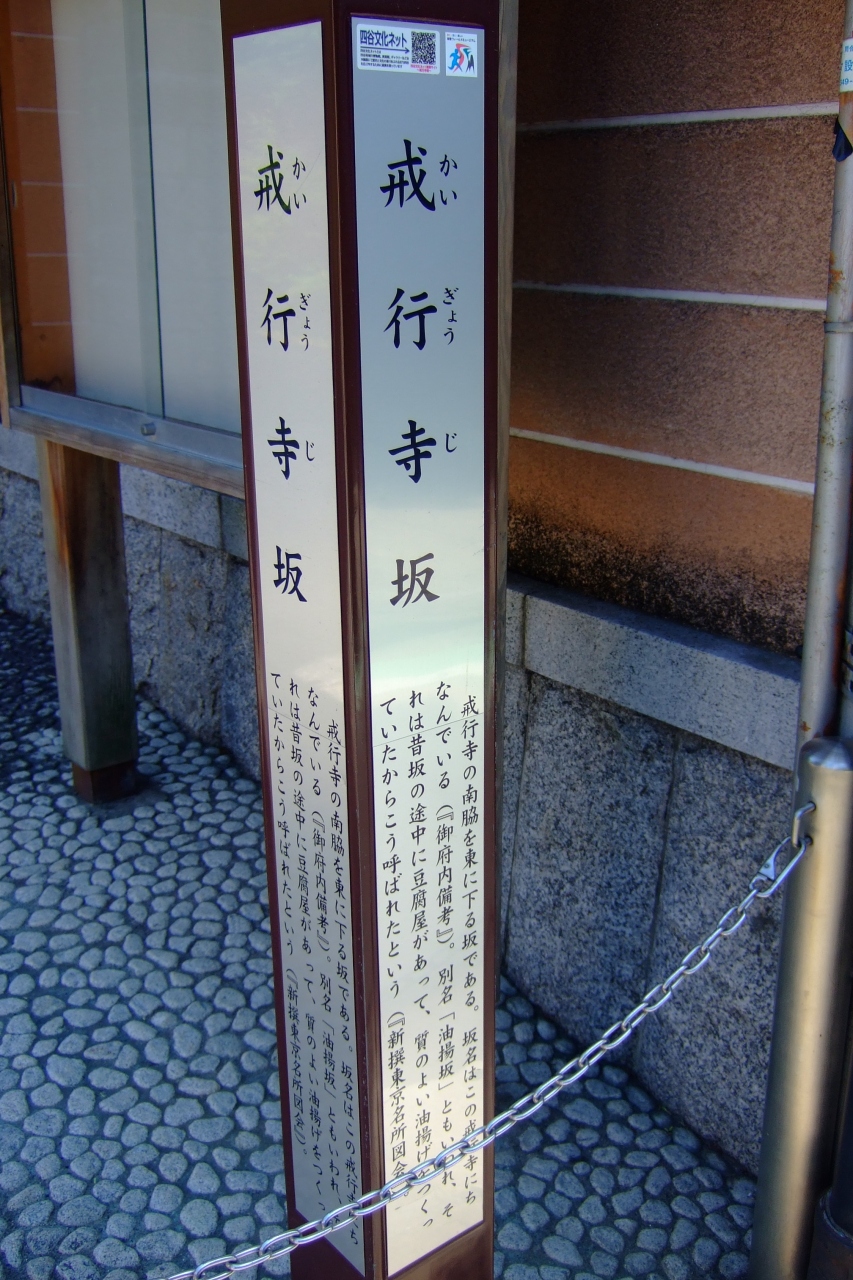 須賀町戒行寺の南脇を東に下る坂で、坂名はこの戒行寺に因むもの。 別名油揚坂(あぶらあげざか)ともいわれる。 これは、昔この坂の途中に豆腐屋があり、良質の油揚をつくっていたためこう呼ばれたのだそうです。