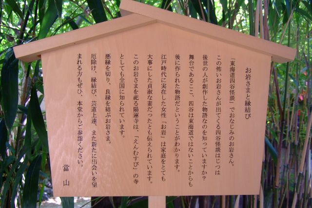 徳川の御家人、田宮又左衛門の娘、お岩は四谷左門町で夫と仲睦まじく暮らし、奉公に出て家計を助けた。 その甲斐あって田宮家は徐々に繁栄。 没後、健気な一生を送った「貞女の鑑」としてあがめられ、日ごろから大事にしていた屋敷杜は「お岩稲荷」として信仰された。