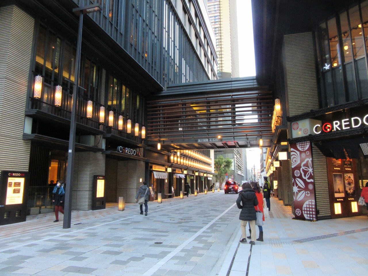 コレド室町のこと。あたりを見渡すとコレド2、3があるではありませんか。黒の色調でお江戸の歴史を感じさせる趣向です。お店は和の老舗が構えています。ショッピング・グルメ飲食に事欠かない。観光旅行者も多そうでした。