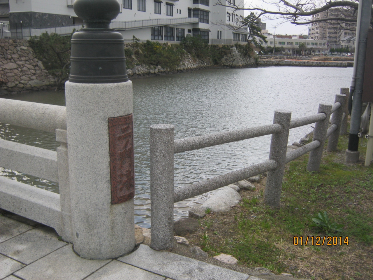 三の丸と二の丸を分けた堀が今も残っています。二の門は二の橋を渡り左手に門があったようです。今はその遺跡はありません。碑もなくただ古地図でのみ確認できます。その門の前の堀です。今も広いです。近くに時の太鼓と奥村五百子の銅像があります。堀は松浦川につながっています。