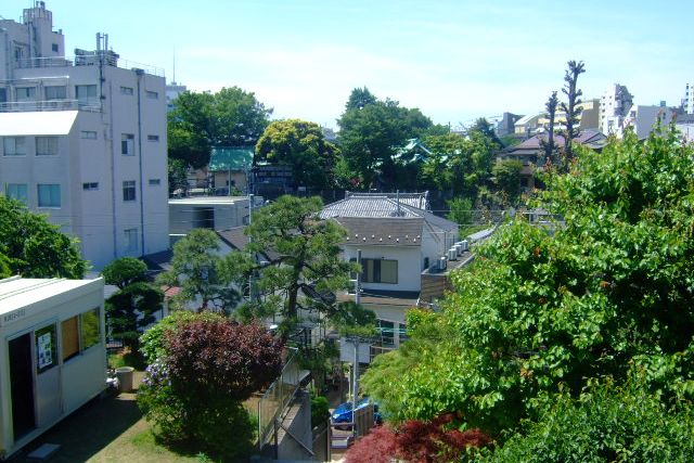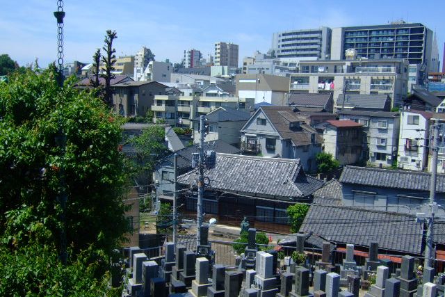 お寺の本堂は階段の上の高台にあり、この高台からは、若葉町の谷町(鮫河橋谷 さめがはしたに)がよく見渡せます。 さきほど歩いてきた須賀神社もこの高台から見ることが出来ました。