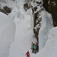 クリスマスツリー状態の木々、エメラルドブルーに輝く氷結の滝。