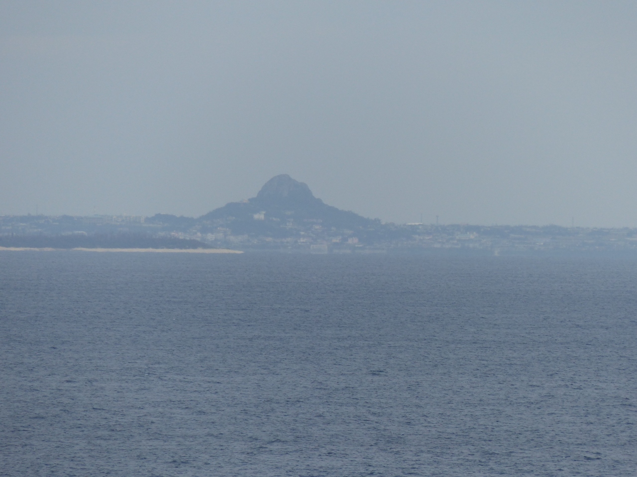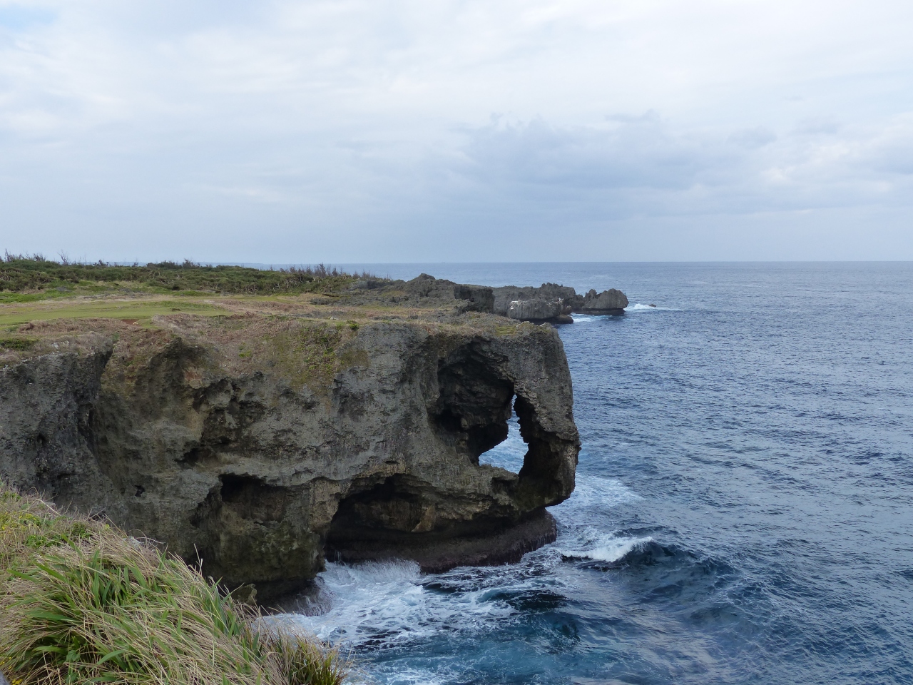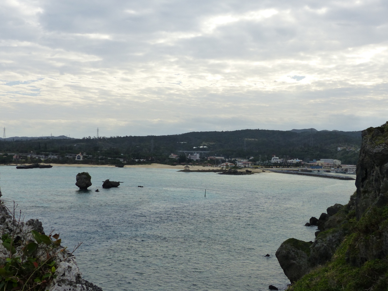 コンビニ付近に「万座毛」の看板があったので、ここを国道から左折して歩く。地図で見た感じでは、ここから近い感じがしたが、実際は坂道がきついので結構距離を感じた。道沿いは普通の住宅がちらほらあるくらいで、観光地感がしないので、ホントにこの先にあるのか?不安になったが、ようやく駐車場が見えた。