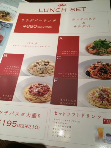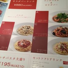 ランチメニューは5種類のパスタがあり、どれもサラダブッフェ付きです。