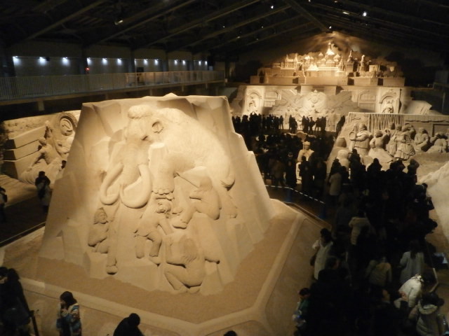 砂の巨大な像を展示する美術館です、冬の間だけ正面の宮殿の砂の像に3Dマッピングが行われていました。