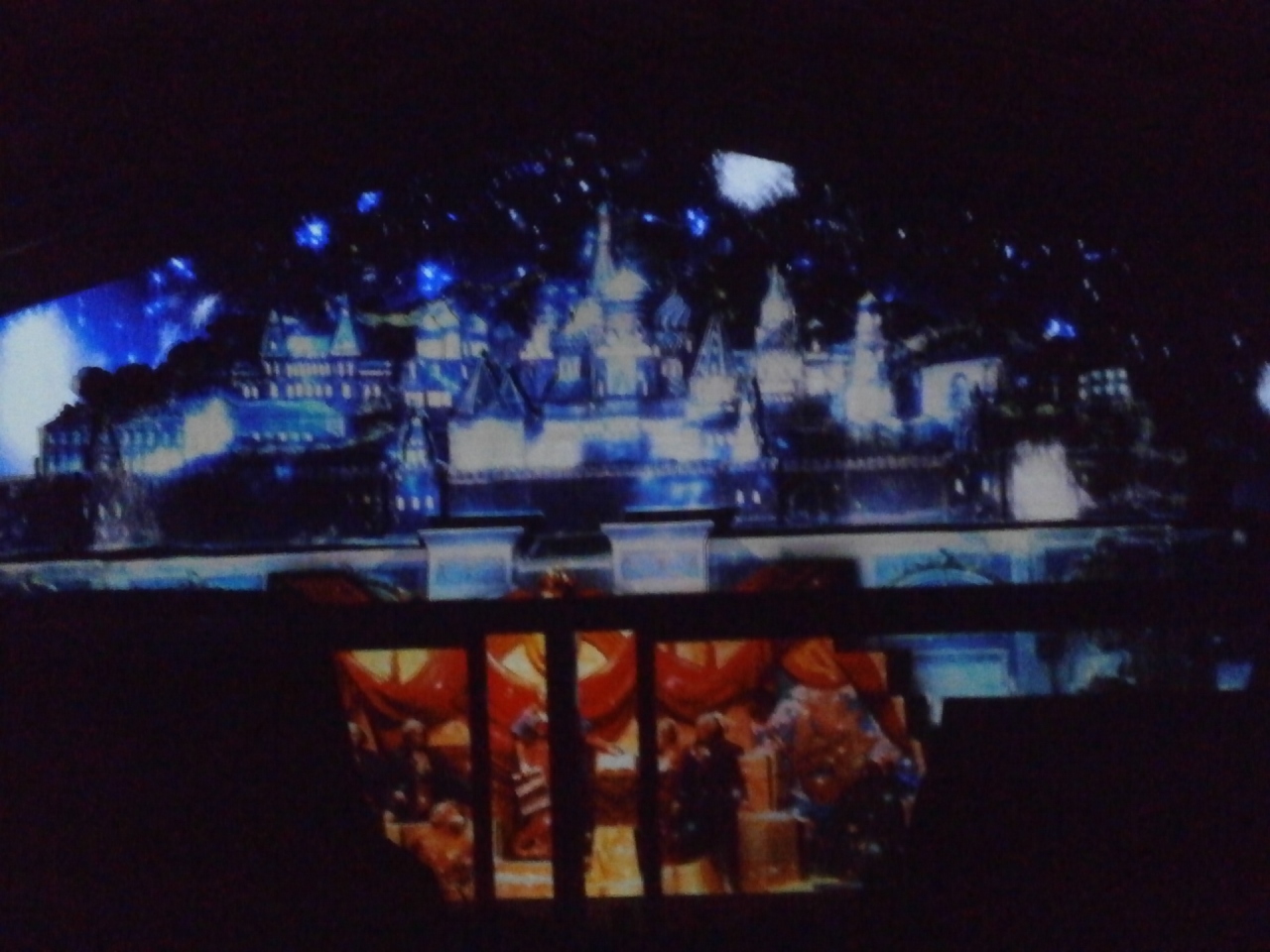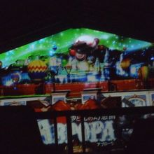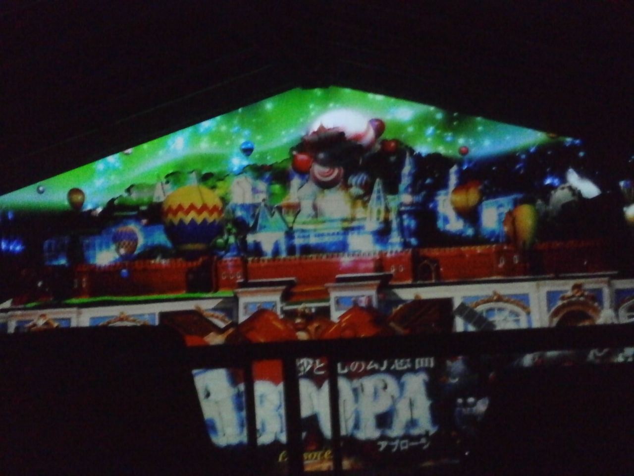 3階では砂像が見渡せると上がったのですが、3Dマッピングで3階正面から見ると前のマンモス像が邪魔で色彩を見るだけになってしまいました。
