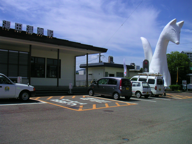 湯田温泉のマスコット白狐"ゆう太"が待つ駅
