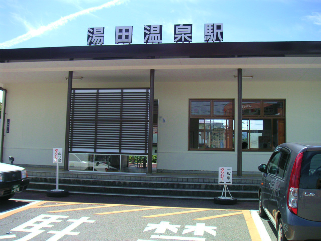 JR西日本山口線の小さな駅です。駅舎正面脇には湯田温泉のマスコットキャラクター白狐"ゆう太"(高さ8メートル)の像があります。中原中也記念館、井上公園等がある温泉街の中心部は、徒歩で10分ほど歩いた所になります。各方面への路線バスが発着する湯田温泉通バス停や観光案内所は温泉街の中心エリアにあります。