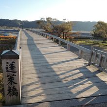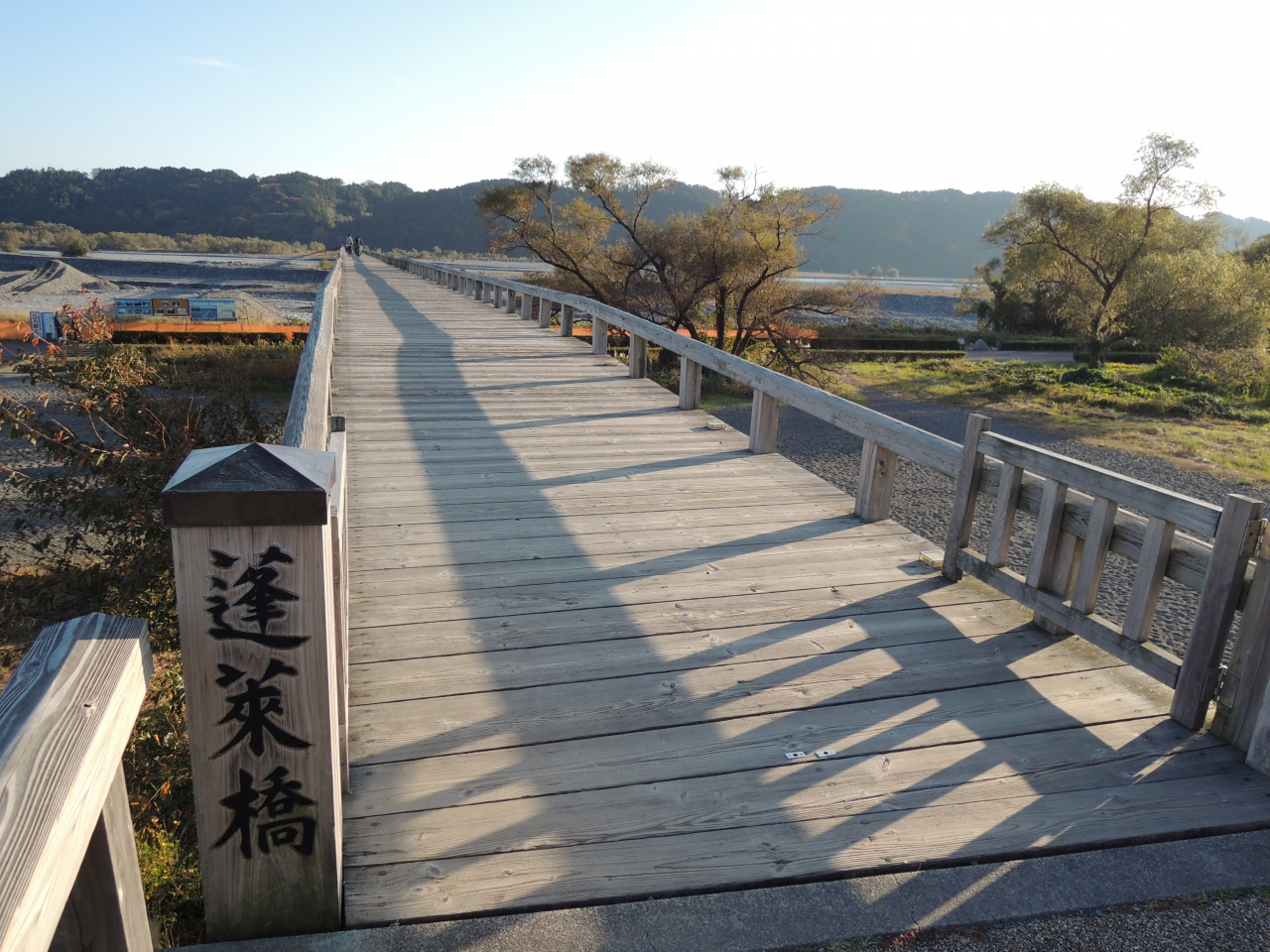 蓬莱橋はギネス認定の世界一の長さを誇る木造歩道橋です。現在、橋脚はコンクリート製ですが昭和40年までは橋脚も木造だったのがすごいですね。900m近くある木造の橋を渡っているともっと長い橋の様に思えてきます。橋の中央あたりには「ど真ん中」という文字が書かれたところがありますので注意して床を見て見てください。夕方などは橋の影が川面に映りそれもなかなか美しいものがあります。