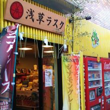 雷門のすぐ左側に黄色の壁がとても目立つのでわかりやすいです。