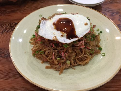 ミックス焼きそばを注文。待つことしばし。運ばれてきたそれは、目玉焼きも載って美味しそうです。