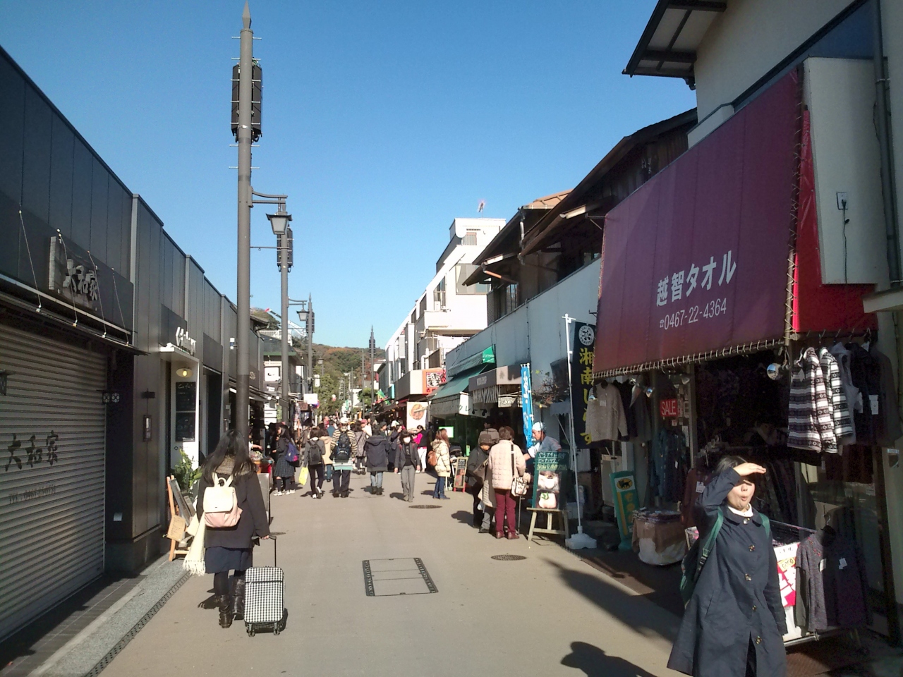 鶴岡八幡宮参拝の後、散策しました。平日でしたが、大変な人でした。しかし、交通規制が行われて車が少ないので歩きやすかったです。散策していると、京都のような風情があり、歴史を感じました。小さい店が立ち並び、面白そうな店も数多くありました。また、横の路地にそれても面白い店があり、昔ながらのお汁粉屋で甘味を楽しみました。