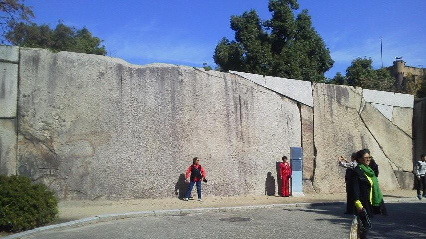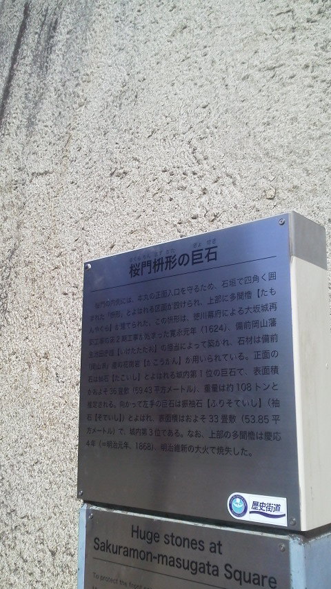 大阪を代表する観光スポットである”大阪城公園”の場内において”桜門”の内側には。巨大な巨石の石垣が待ち構えています。その中で中心的な巨石がここ「蛸石」。これらは本丸を守る”桜門の枡形巨石”といわれ、石材は備前のかこう岩から作られているとのこと。しかも、この”蛸石”が大阪城場内で一番の巨石とのこと(案内板で記載されています)。正面から見ると迫力というか圧倒されます。江戸時代にこの巨石を石垣にする技術と威厳つ素晴らしいですね。