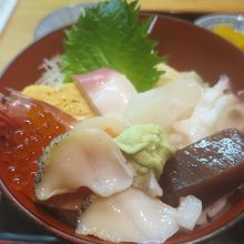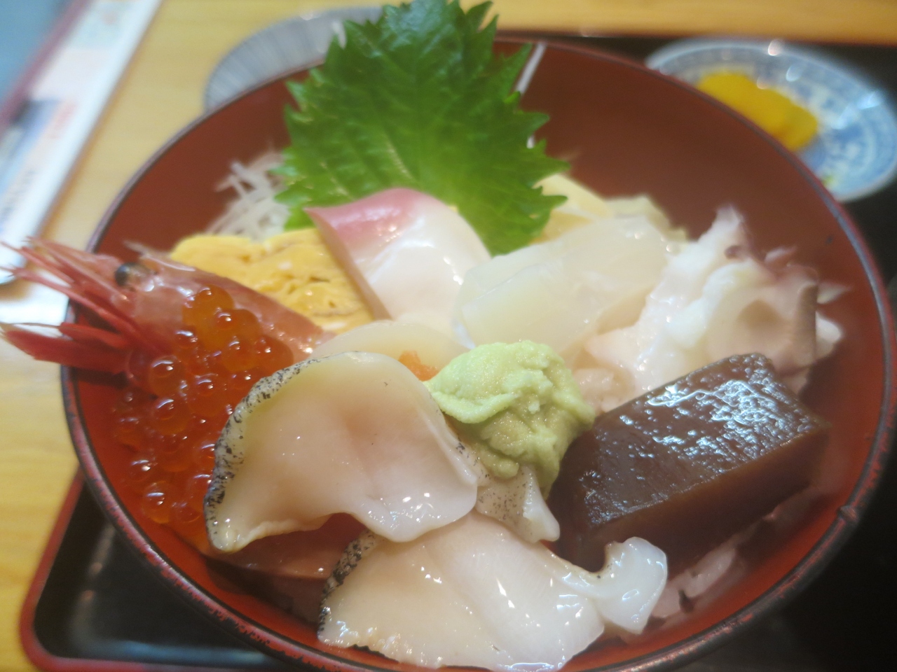 ランチで海鮮丼をいただく。定番の具材が並ぶ中、やはり北海ならではの存在感を示すのは貝!北寄貝とツブ貝、絶品でした。その他、エビ、イクラ、イカなど種類も豊富。値段もそこそこなので、吸い物があら汁や青さ汁だったらもっと良かったです