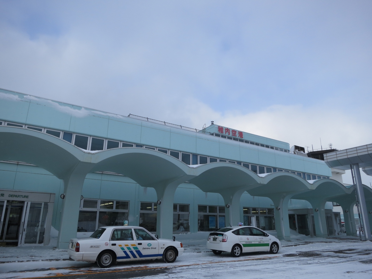 礼文空港が休止中につき、実質上の日本最北端の空港。市内からバスで20分(600円)程度です。冬の定期便は千歳が2便、東京が1便。欠航が多いことで有名なので出発前からビクビクしていたものの、なんとか「利用者」になれました。売店も充実していてこじんまりとした地方空港です